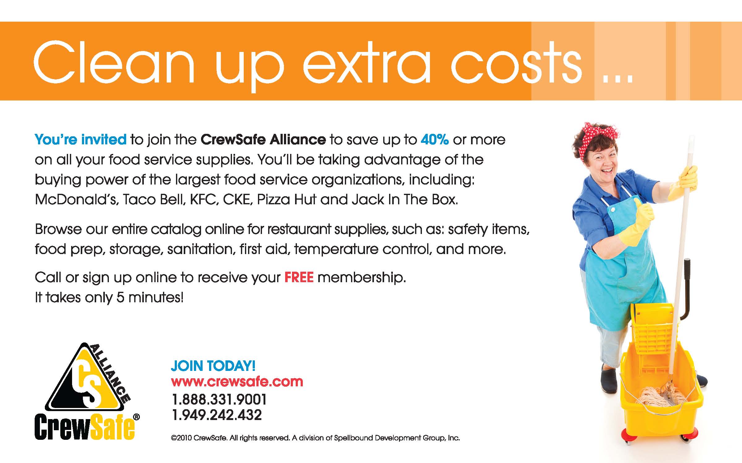 Spellbound Development Group, Inc. is starting a new division of their company called CrewSafe. A restaurant can join the CrewSafe Alliance to benefit from discounted prices on restaurant supplies! Companies like McDonald’s, Taco Bell, KFC, CKE, Pizza Hut and Jack In The Box are all members of CrewSafe Alliance. CrewSafe came to me asking to come up with some ideas for a national campaign to draw attention to independent franchise owners to join the alliance. Using bold colors to match their website, I wrote fun attention getting headlines and imagery to motivate membership. These three inserts stack one on top of each other and is inserted into a die-cut folder to show headlines on the top.